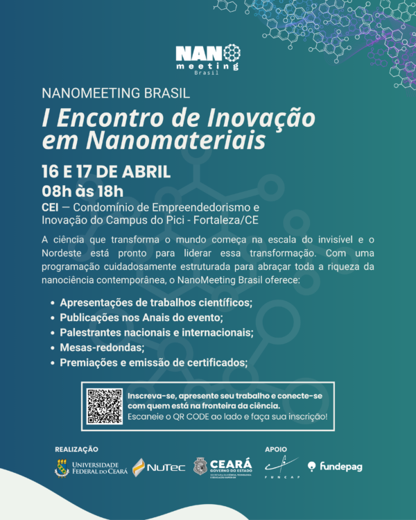 O avanço da ciência em escala microscópica ganha destaque com a realização da primeira edição do NanoMeeting Brasil – I Encontro de Inovação em Nanomateriais, que acontecerá nos dias 16 e 17 de abril, das 8h às 18h, no CEI – Condomínio de Empreendedorismo e Inovação da Universidade Federal do Ceará (UFC), localizado no Campus do Pici, em Fortaleza.
