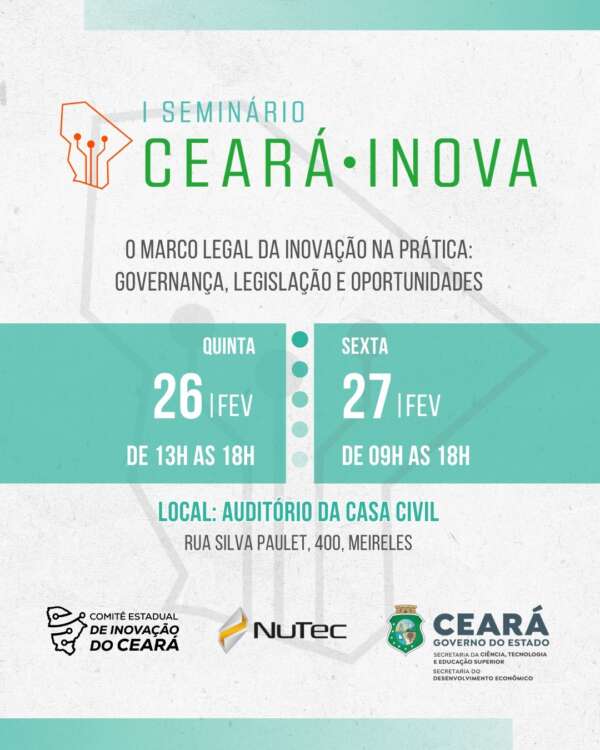 Com o objetivo de promover um diálogo qualificado sobre a aplicação prática do Marco Legal da Inovação, o Governo do Ceará realiza, nos dias 26 e 27 de fevereiro, o I Seminário Ceará Inova. O evento acontece no Auditório da Casa Civil, em Fortaleza, e é uma iniciativa conjunta da Secretaria do Desenvolvimento Econômico do Ceará (SDE), Secretaria da Ciência, Tecnologia e Educação Superior do Ceará (Secitece) e do Núcleo de Tecnologia e Qualidade Industrial do Ceará (Nutec).
